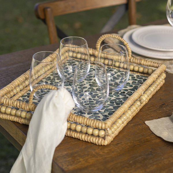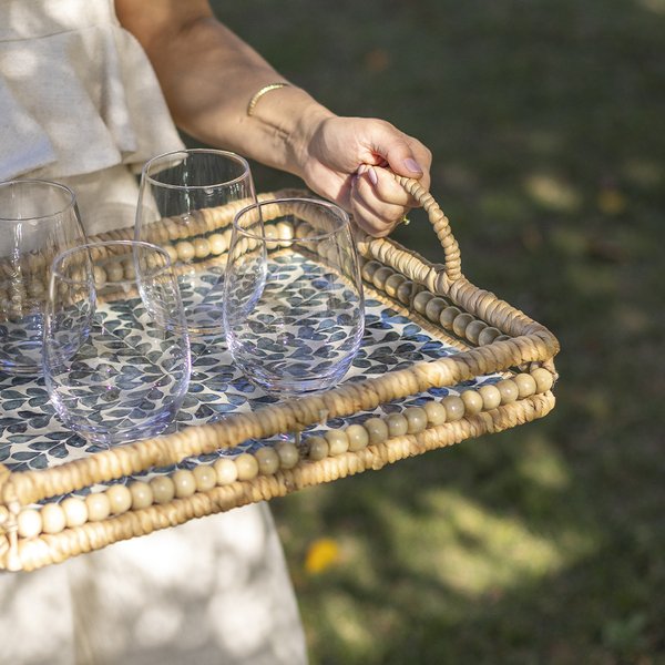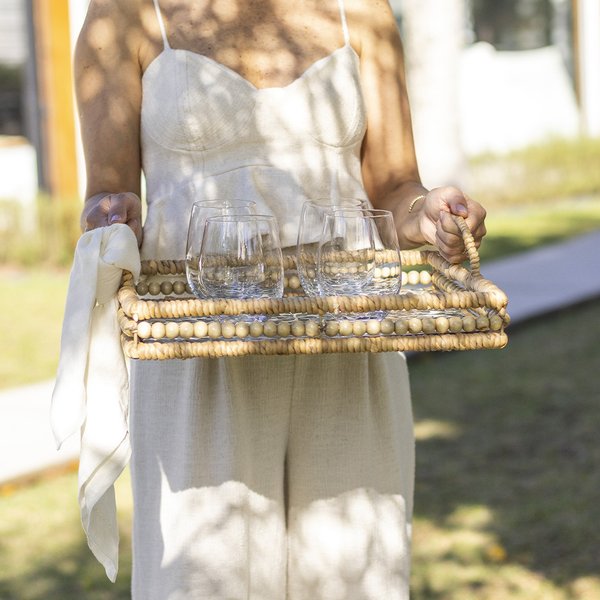 Produzida em grama marinha, e adornada com esferas de madeira e fundo de conchas, a Bandeja Fiber Shell Wood reflete a harmonia entre o rústico e o sofisticado, criando um visual que remete à natureza e ao frescor das paisagens litorâneas.