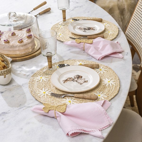 Seu design é realçado por bordas finamente bordadas com o icônico ponto picueta, um delicado ponto decorativo que cria um relevo encantador. Essa técnica não apenas confere uma textura agradável ao toque, mas também proporciona um acabamento elegante, elevando qualquer mesa a um novo patamar de sofisticação.