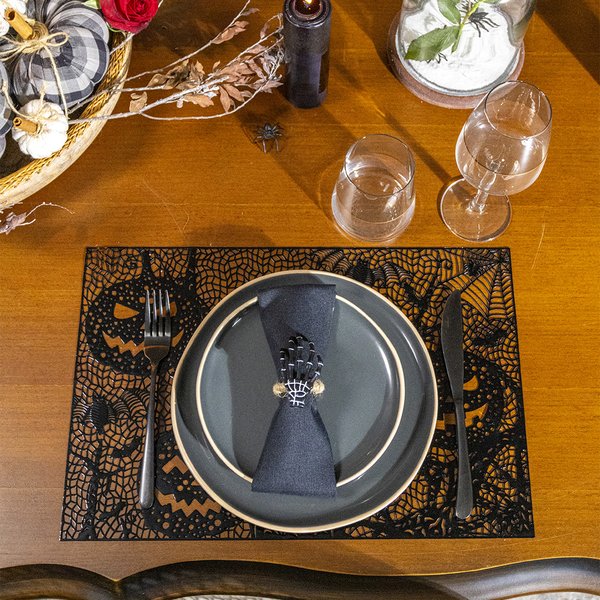 Anéis de Guardanapo: Adicione um charme extra com anéis de guardanapo inspirados no Halloween. Feitos com materiais de alta qualidade, eles podem apresentar detalhes como esqueleto, teia ou aranha, trazendo um toque especial a cada lugar.