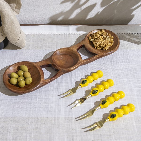 Seu formato “três em um” integra três tigelas em perfeita harmonia, oferecendo praticidade e equilíbrio para servir diferentes petiscos de maneira organizada e sofisticada.