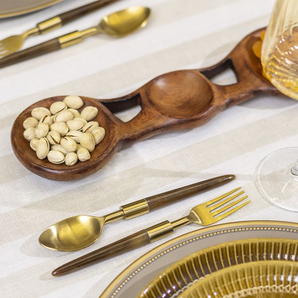 Seu formato “três em um” integra três tigelas em perfeita harmonia, oferecendo praticidade e equilíbrio para servir diferentes petiscos de maneira organizada e sofisticada.